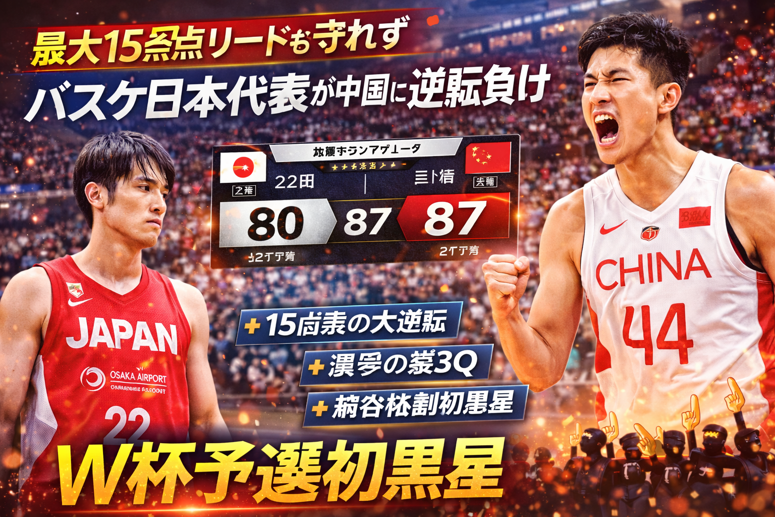 バスケットボール男子日本代表が、中国代表とのW杯アジア地区予選で痛恨の逆転負けを喫しました。