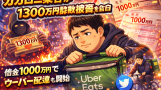 カカロニ栗谷がテレビ番組で1300万円の詐欺被害を告白。借金1000万円を抱え、ウーバーイーツの配達バイトも始めたと明かしました。番組で語られた内容やSNSの反応をまとめています。